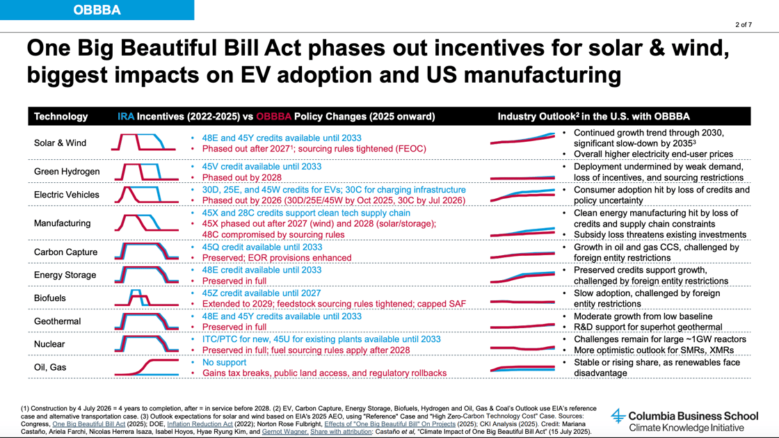 Together with a robust innovation ecosystem and abundant growth capital, these factors position the United States’ energy transition to continue making progress. Although the framework for clean energy has become more fragmented, it remains stronger than it was before the Inflation Reduction Act, with several important provisions still intact. Many of the technologies most affected by the OBBBA, including solar, wind, electric vehicles and heat pumps, are already competitive in the marketplace without subsidies. And while the OBBBA undoubtedly introduces new constraints, it also clarifies the opportunities and strengthens long-term trends toward domestic manufacturing and supply chain resilience.